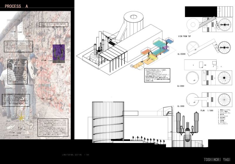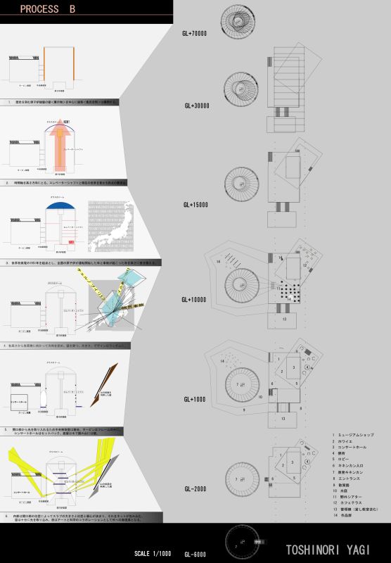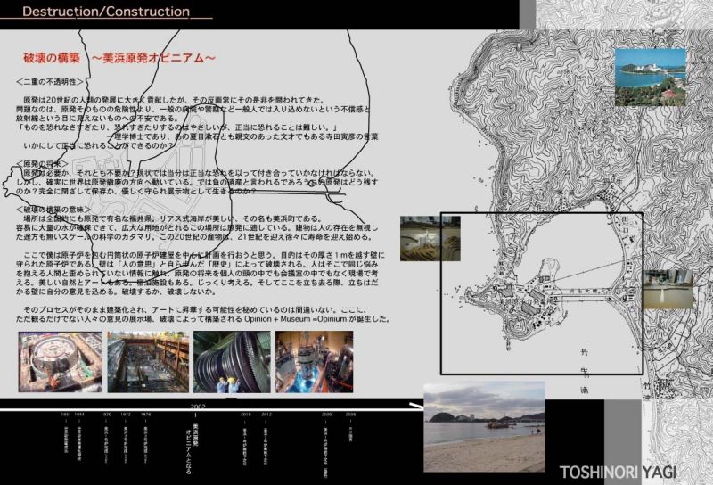 ここで僕は原子炉を包む円筒状の原子炉建屋を中心に計画を行おうと思う。目的はその厚さ1mを越す壁に守られた原子炉である。壁は「人の意思」と自ら歩んだ「歴史」によって破壊される。人はそこで同じ悩みを抱える人間と歪められていない情報に触れ、原発の将来を個人の頭の中でも会議室の中でもなく現場で考える。美しい自然とアートもある。宿泊施設もある。じっくり考える。そしてここを立ち去る際、立ちはだかる壁に自分の意見を込める。破壊するのか、破壊しないのか。