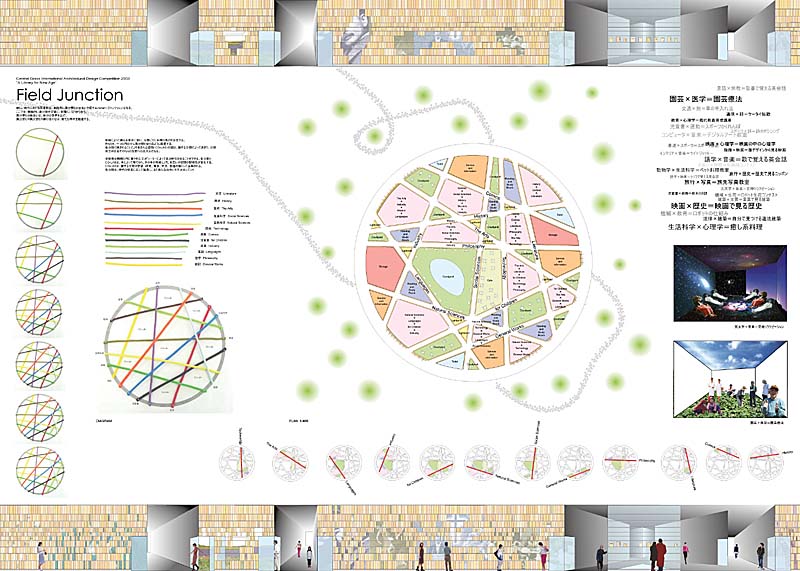 来館者は周囲の円に置かれたコンピューターによって本の所在を知ることができる。各分野とCO-LABは、本によって隔てられ、その本の増減により、お互いの空間の関係性が変化する。
